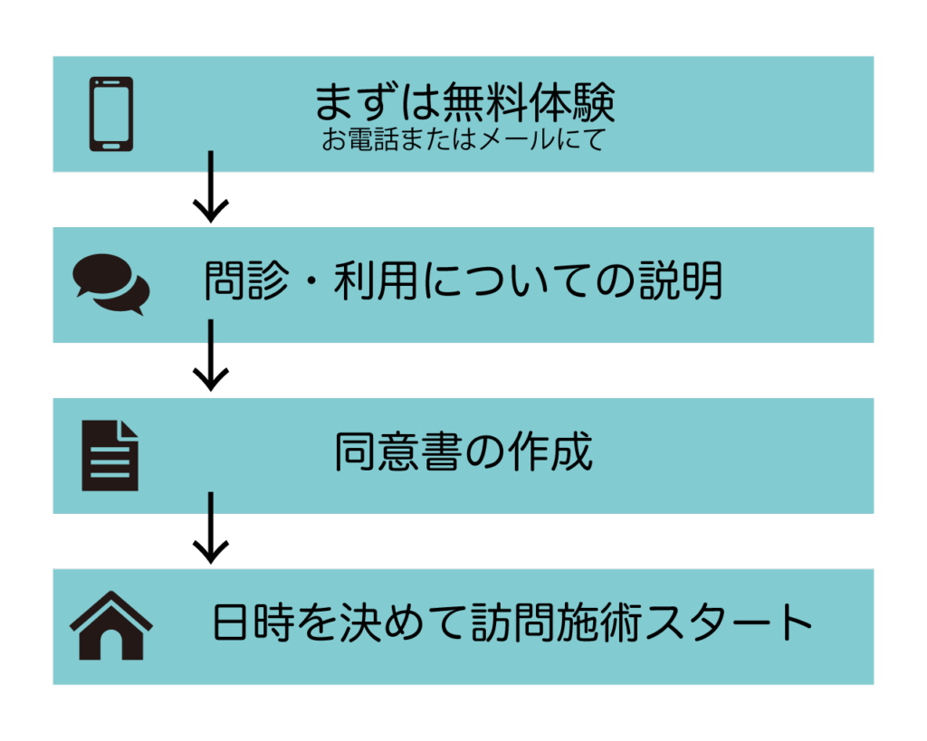 無料体験では、経験豊富な国家資格者(あん摩マッサージ指圧師など)がご自宅へ訪問し、丁寧に問診・触診を行った上で、実際の施術を体験していただけます。